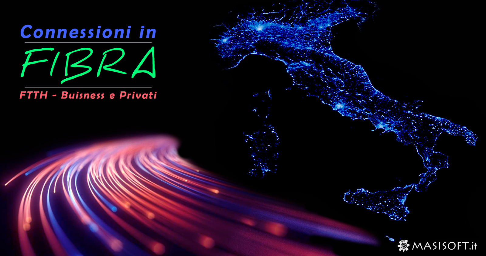 Grazie alla collaborazione commerciale con gli operatori di servizi internet, Masisoft è in grado di offrire la consulenza per l'attivazione delle connessioni in fibra ottica in tutta Italia. Per gli utenti residenziali che hanno bisogno di conoscere la copertura FTTH presso la propria abitazione e per le aziende che necessitano di connessioni iper-veloci o dedicate per il loro buisness.